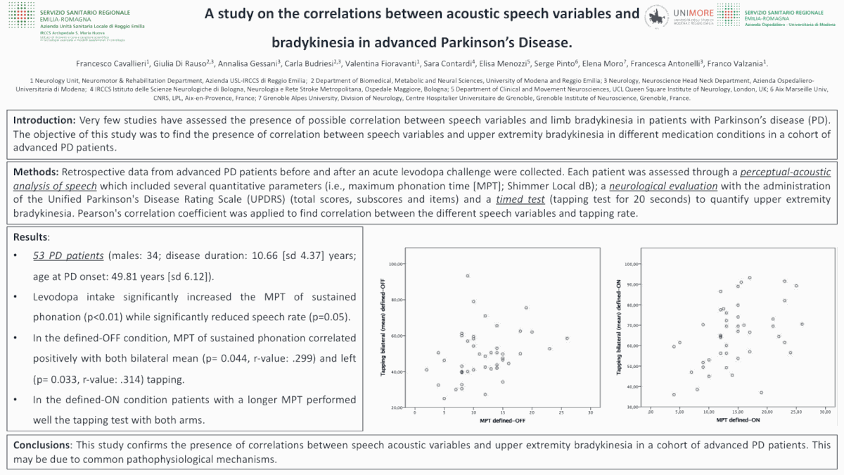 P166 Studio di correlazione tra parametri acustici dell’eloquio e bradicinesia dell’arto superiore in pazienti affetti da malattia di Parkinson in fase avanzata