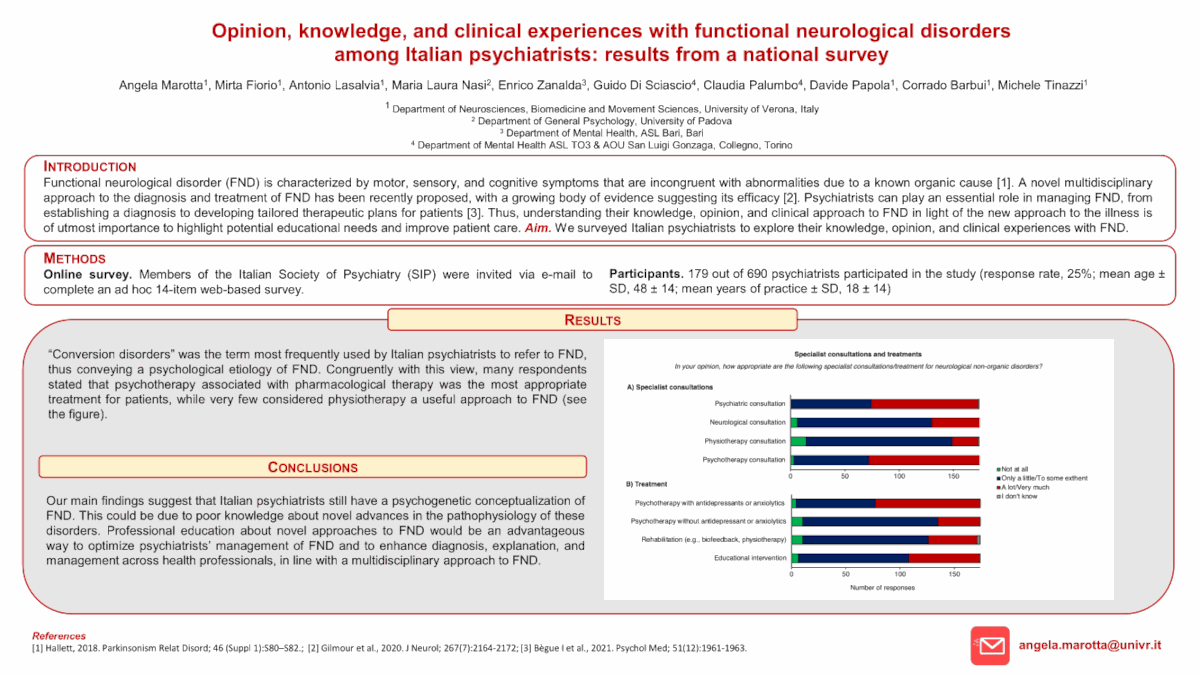 P26 Opinioni, conoscenze ed esperienze cliniche degli psichiatri italiani riguardo ai disturbi neurologici funzionali: risultati di un’indagine nazionale