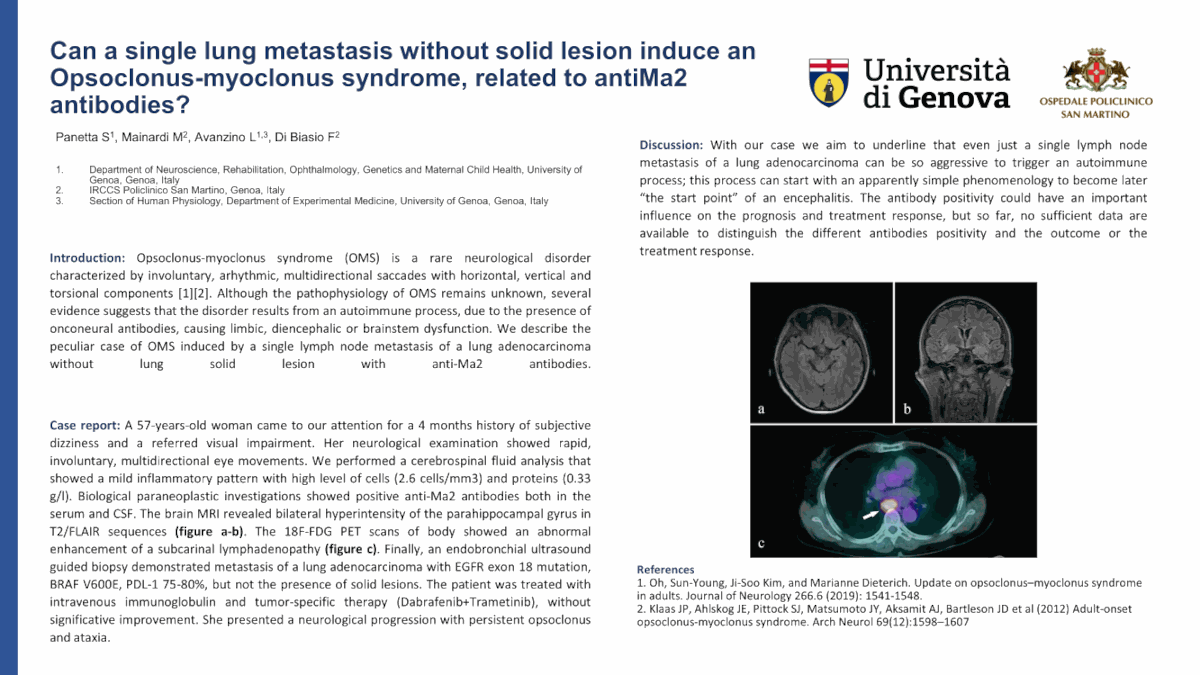 P85 Può una singola metastasi in assenza di una lesione tumorale solida determinare una sindrome opsoclono mioclono correlata agli anticorpi anti Ma2?