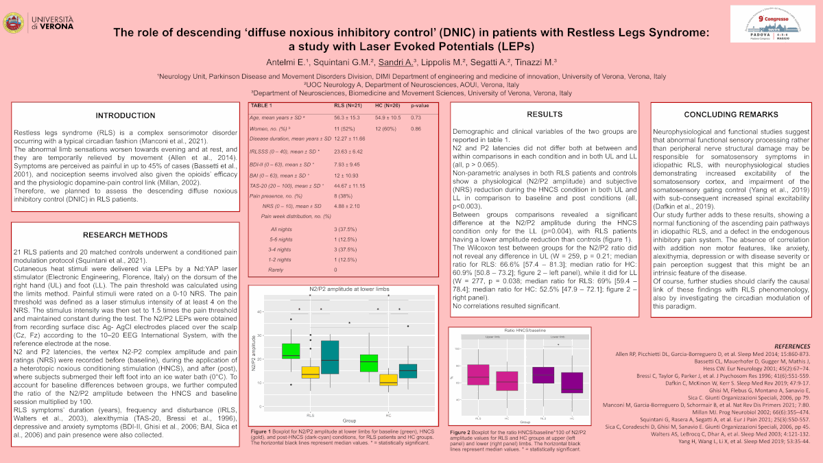 P140 Il ruolo del controllo discendente inibitorio doloroso nei pazienti con Restless Legs Syndrome: uno studio con i potenziali laser evocati