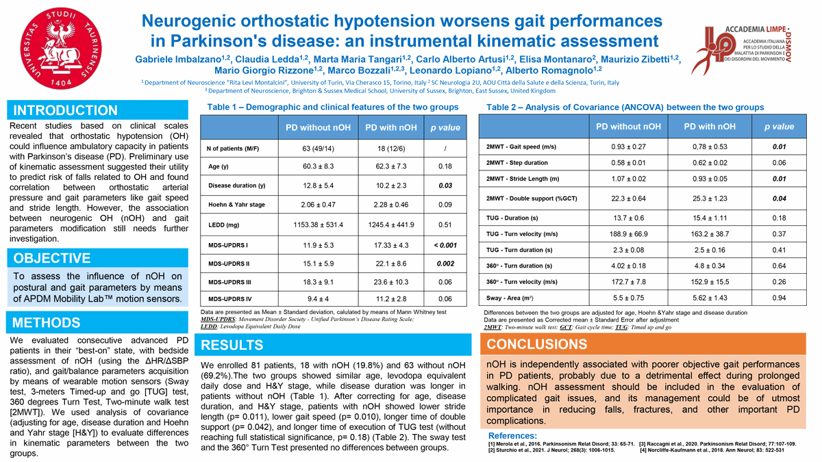 P174 L'ipotensione ortostatica neurogena peggiora le performance del cammino nella malattia di Parkinson: valutazione strumentale dei parametri cinematici